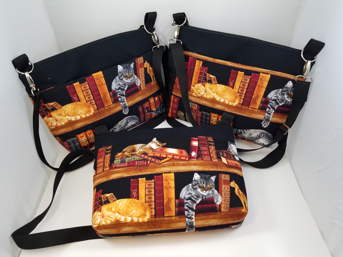 Style: Three (3) Books & Cats Crossbody Bags with adjustable straps, Top Zipper.