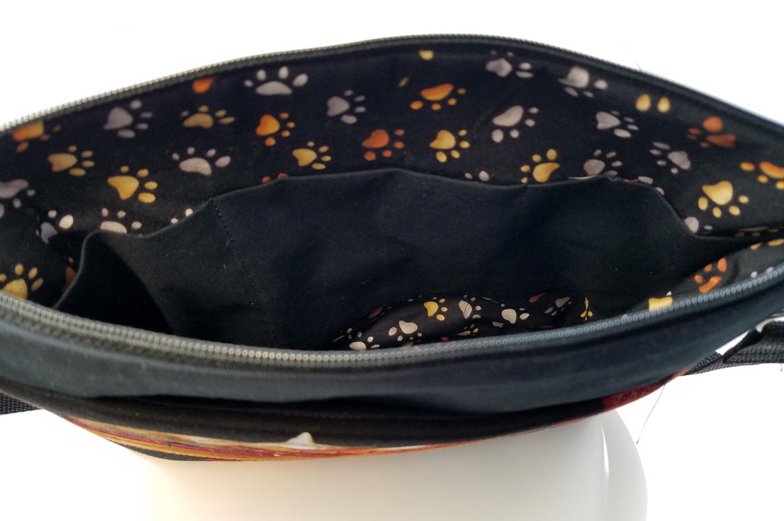 Colors: The cats and books main print features black, rusts, tans, dark red, grays, white. Top and inside pockets is black. Inside lining is black with tan, rust and white paw prints. Strap hardware is black.