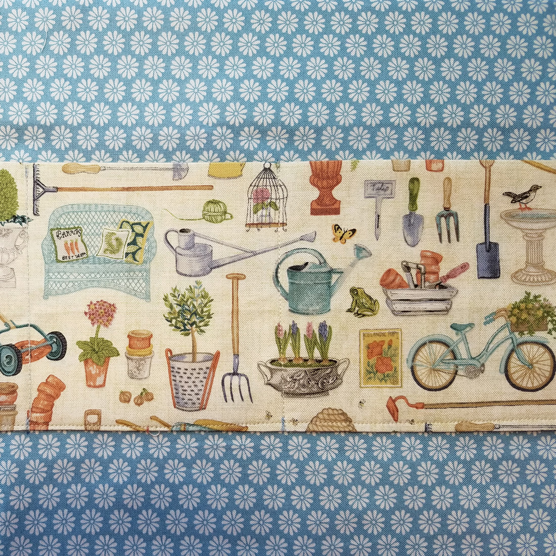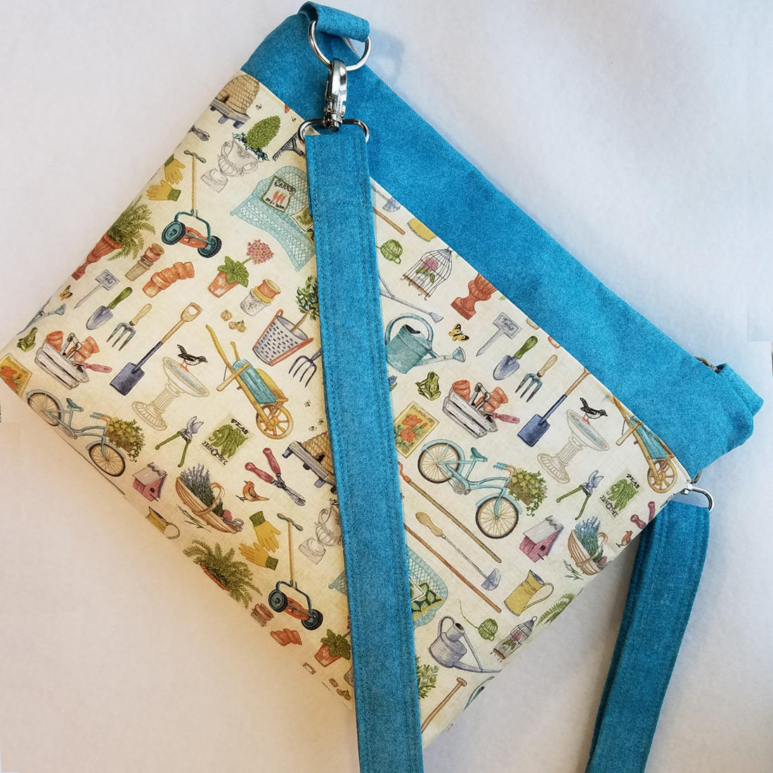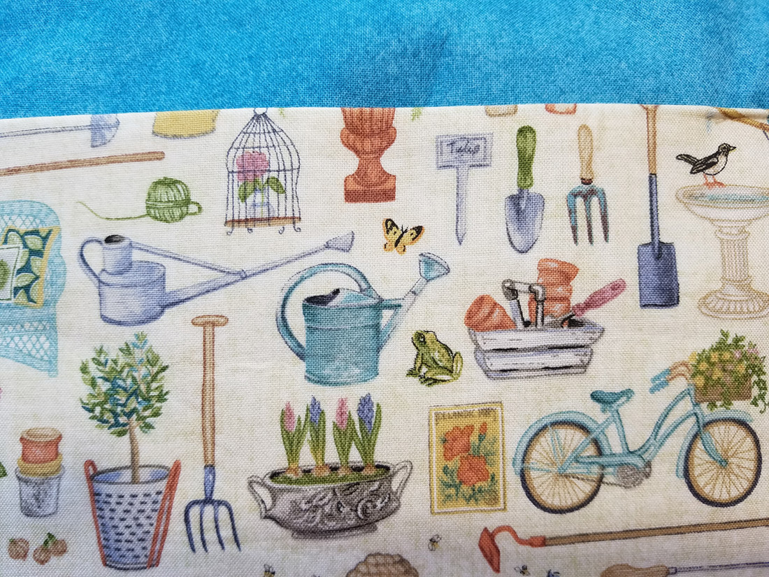 Colors: print is cream background; garden items are light blue, teal, mauve, greens, rusts. Lining is coordinated light blue background with small white flowers. Straps and top are teal.