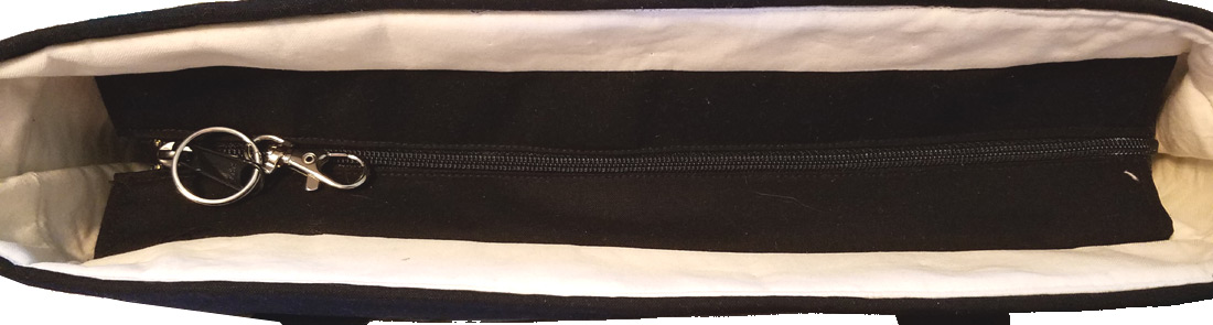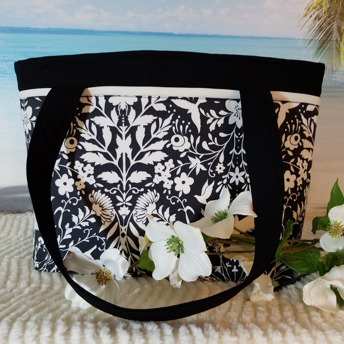 Nyah is a beautifully coordinated design in black and ivory white. This handbag is appropriate in any season, and with any outfit. The outside top, straps, and zipper area are black. The lining and outside horizontal accent is ivory, with six pockets made of the outside fabrics. There are two hidden pockets on the outside between the straps. 4 black metal feet on the bottom protect your bag when you have to sit it places you would rather not.